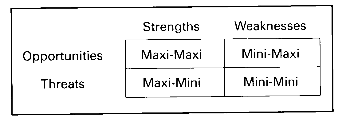 Mini-Mini strategies attempt to minimize the company's weaknesses and prevent external threats. This section matches the firm's threats and weaknesses in order for the company to recognize the potential situations that could harm its operations. Once these possible conditions are realized, the company can conceive of ways to protect its business. For example, a firm can enter into a strategic alliance or merge with one of its competitors to protect its operations from a rival firm. Moreover, the options to withdraw from a market or suspend operations are always present.